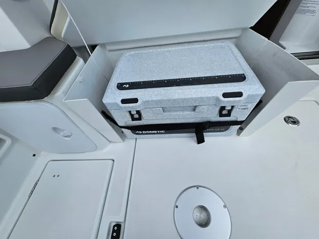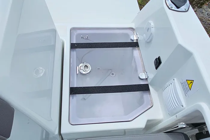 In addition to the recirculating live well tank, this Fishing version also has three storage compartments under the cockpit sole, one of which can be used as a fish box. Rod holders are fitted into the freeboards, as well as on the roof’s hardtop.