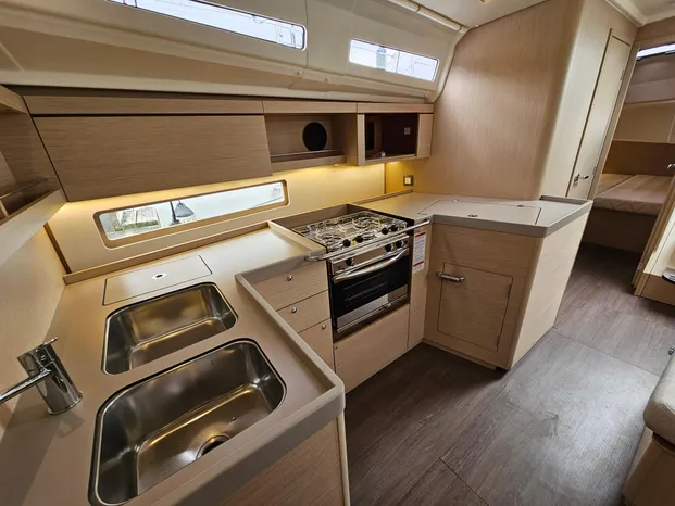 The styling of the interior by Italian designer Nauta is remarkably bright and excels in the skillful arrangement of the living spaces. She has C-shaped galley to the starboard that offers an abundance of storage and a spacious countertop. On the port side, there is a large salon with a table, complete with a removable bench. A chart table at the foot of the companionway provides ample working space. Everything is modular, so that everyone can live the way they want and enjoy sailing wherever the wind takes them.
