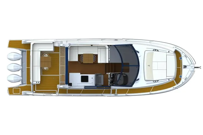 Faithful to the Antares range, the Antares 12 Coupe affirms its position as a versatile family cruiser, designed for long-distance sailing in all latitudes. Benefiting from proven expertise and complementing the Antares 12 Fly, it combines comfort, elegance and innovation with a spirit of shared pleasure and serenity. With its unique design and modern shape, the Antares 12 Coupe embodies the aesthetic codes that have been the signature of the range for 45 years. The hull glazing and gunwale create a sleek line, while the protective, streamlined aft roof enhances the overall balance of the boat. The electric starboard platform naturally extends the outdoor living space and simplifies access to the water for paddleboarding or swimming.