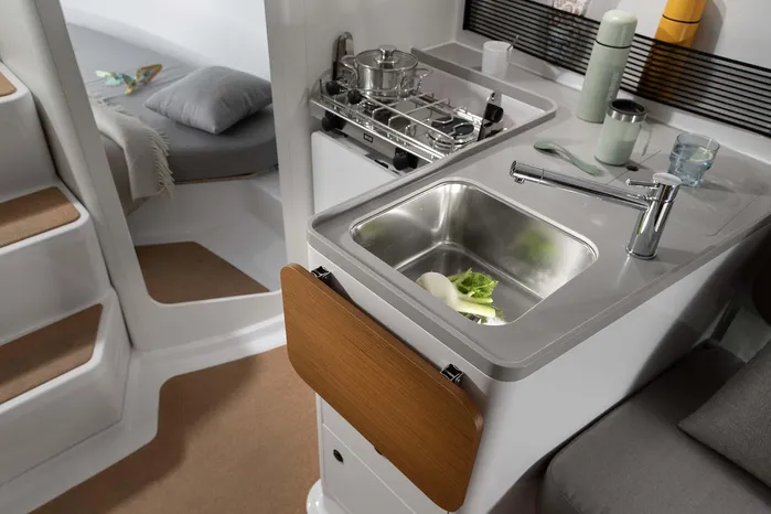 The deck and generously sized cockpit layout were designed with two goals: minimizing clutter to create a spacious and comfortable chill-out area while ensuring outstanding sailing ergonomics. Two cockpit layouts are available: one for day sailors and cruisers and another for racers. In the cruising layout, the mainsail bridle and German sheet system enable the cockpit floor to be completely clean while allowing easy control of the mainsail through generously sized winches. The racing layout adds a mainsail traveller with a direct and fine-tuning mainsheet system, creating a familiar workspace for racing sailors.
