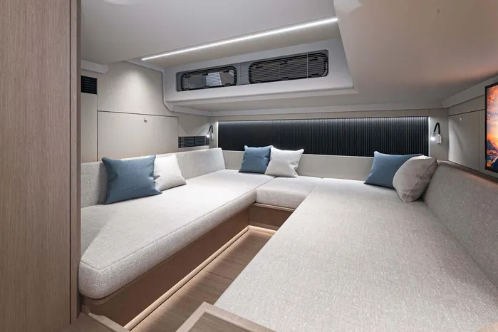 Calm interior spaces with ambient lighting embrace the new Gran Turismo’s design ethos of simplicity or “Kanso”. The forward section flows to an island berth with ample storage while the convertible midship berth offers a lovely versatile space for movie night, for storage, for a quick nap, or whatever you feel up to.
